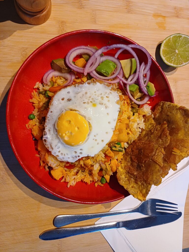 Het pakket is voor 2 personen en bevat het volgende, rijst, wortel, ui, paprika, knoflook, rode ui, kip boulion, eieren, abvocado, sperziebonen, lente ui, quacamole, patacones.
